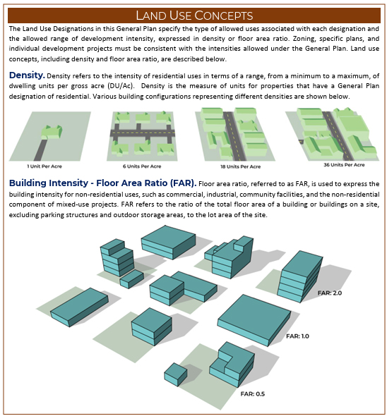 The Land Use Element in a General Plan provides for development and resource conservation, while promoting diverse opportunities for economic development and encouraging the provision of a range of housing options attainable to all income levels. State law requires the Land Use Element to address: