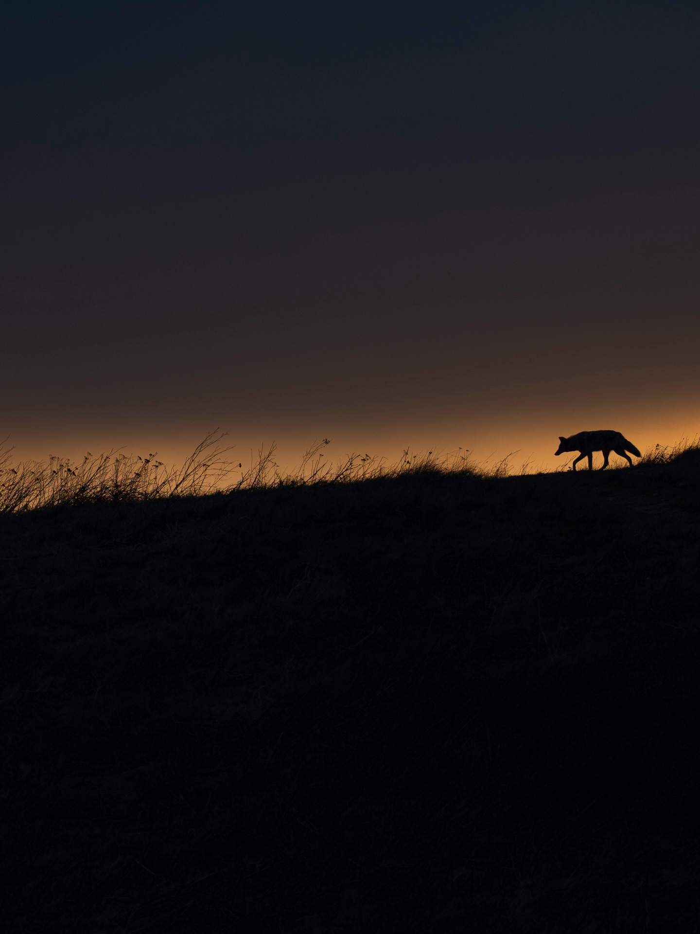 “I feel like coyotes enjoy trotting across ridges, so I am always on the lookout for them around dusk. As a magnificent and clouded sunset was materializing, I spotted this coyote on a distant ridge. I hurried to position myself and was able to catch the canine as it was crossing a ranch road with lower grasses.” The shot was from about 500 feet away.
