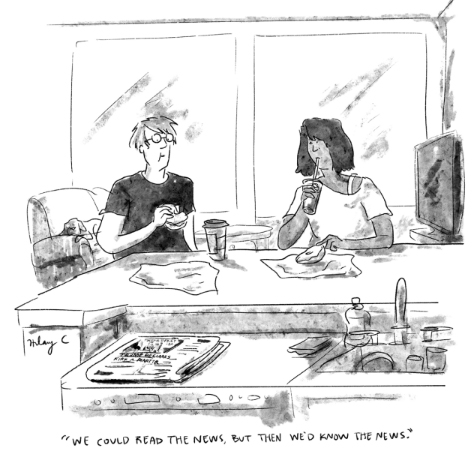 Cartoon by Hilary: “We could read the news, but then we’d know the news.”
