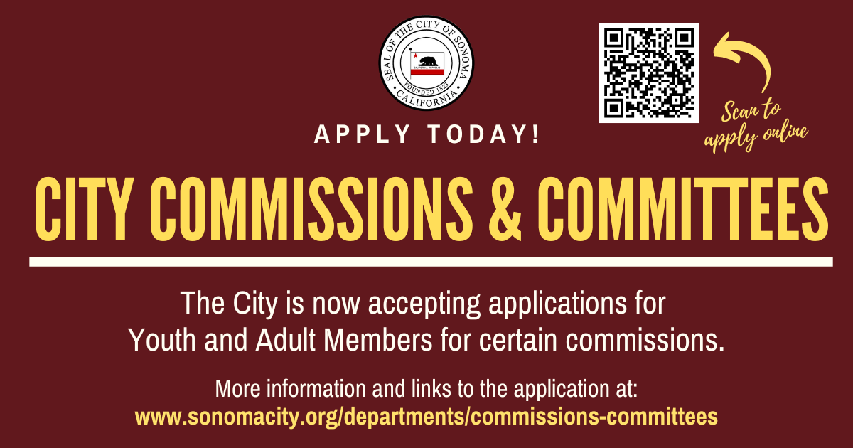 The City of Sonoma is currently accepting applications for several City and regional commissions and committees – and encourages the public to apply.