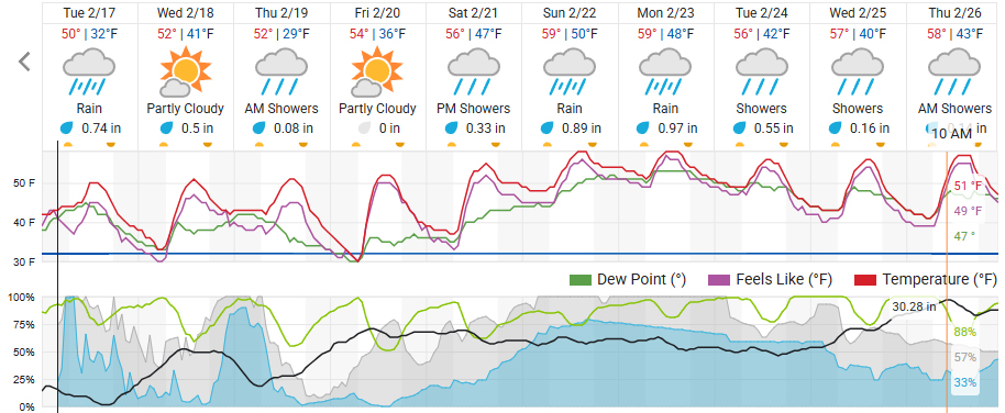 The rain gauge at Second Street East and Napa Street has recorded three inches of rain since February 10, 2026. A new round of wet weather will arrive Tuesday accompanied by the lowest temperatures of the season, as low a the upper twenties by late Thursday night and Friday morning.