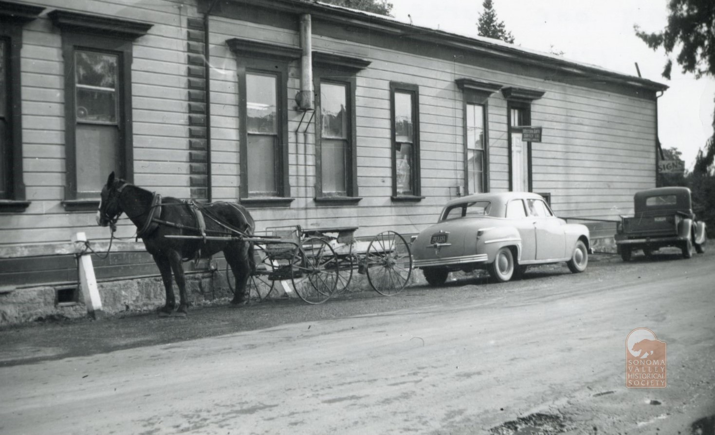 Here is Charles Baine’s horse and rig ‘parked’ at the Union Hotel (now B of A) on First Street West. This old boy and his wagon, photographed in December of 1951, was the last horse-drawn rig in Sonoma.