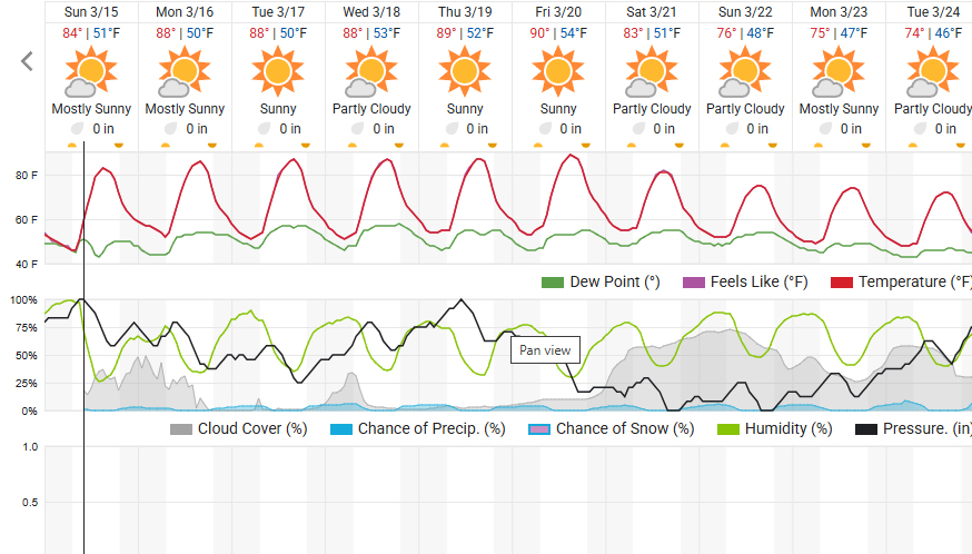 It will seem like spring never happened next week as we move into a period of summer-like temperatures. A high of 90 degrees is forecast for Friday, and the preceding days will be almost as hot. Get ready! Stay hydrated, check your irrigation systems, and don’t forget your sunscreen.