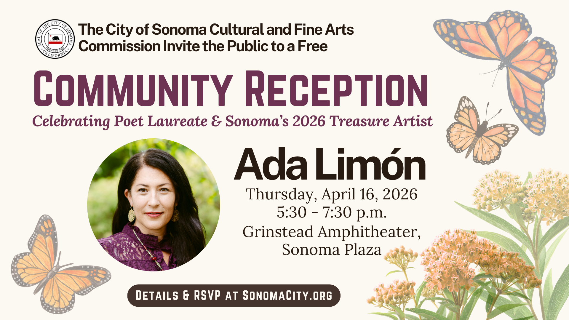 The City of Sonoma and the Cultural and Fine Arts Commission invite the community to a special evening celebrating Sonoma’s 2026 Treasure Artist, Ada Limón.