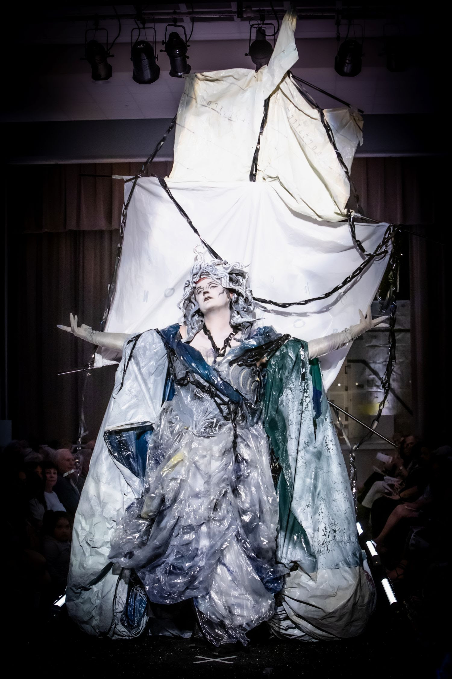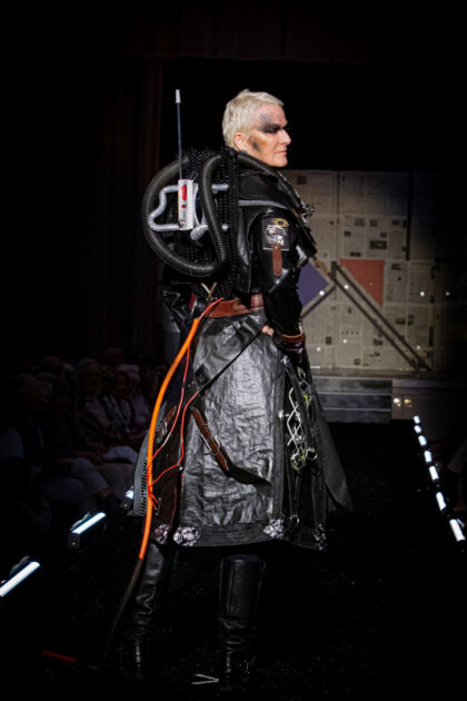 The runway judges were the very fashionable Ryan Lely, Marie Kneemeyer, the Public Education Manager at Recology Sonoma Marin, and visiting fashion designer /Instagram sensation, Cory Infinite of Kansas City, Missouri. Between watching both shows and talking to designers backstage, each judge scored the adult designs in the following categories: Most Theatrical, Avant-Garde, Best Use of Unconventional Materials, and Upcycled Textiles. Youth, ages 9-13, and teens, ages 14-17, were judged separately.