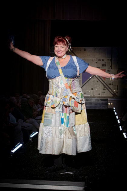 Over 800 people attended the sold-out runway shows at the Sonoma Veterans Hall on Saturday, May 18th. Over 40 models walked the 60-foot runway like pros after just one night’s rehearsal with runway coach Cat Austin. Each wore a design created from garbage, recyclables, thrifted items, and upcycled textiles.