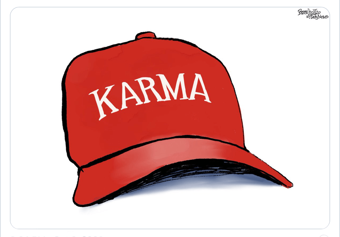 I don’t wish Covid-19 on anyone, but in all honestly I am more dismayed by the nearly 210,000 deaths that Americans have suffered than the prospect of Donald Trump getting hoisted by his own petard. It need not have been like this; the opportunity to break the Karmic chain of pandemic events was diverted by the one man with the power and authority to help do so. Instead, he treated this pandemic foolishly, wasting precious time and sowing confusion. Now the Karma of his actions have come into the White House.