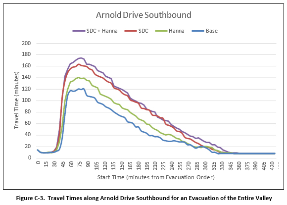 For the projected Arnold Drive southbound model, at 120 minutes after the evacuation notice, it is projected to take motorists 171 minutes to evacuate to Sonoma and beyond under current conditions, versus 285 minutes if the SDC plan were built out. Under present conditions that amounts to nearly three hours. If the current SDC plan were built out, travel time is projected to increase by two-thirds, totaling just under five hours.