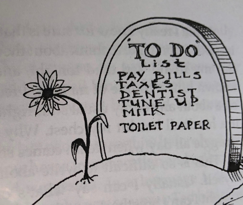 I had to laugh at myself after reading that. I realized one great thing about inevitably dying would be the end of my to do list. No more DMV exams, dental visits, crazy politicians, waking up to alarm clocks, diets, the absolute end of unsubscribing from email ads.