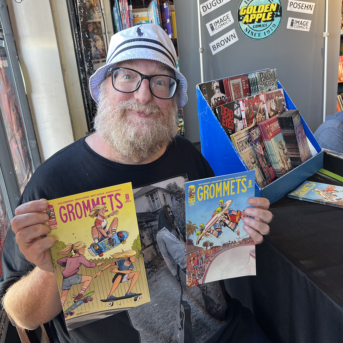 The comic books are “GROMMETS,” co-written with fan favorite Rick Remender. A loving look at 80s skate culture based on true adventures of two punk and metal misfits and their close circle of pals, and RIFTERS written with Joe Trohman (guitar player for Fall Out Boy). Time travel police procedural with jokes. I highly suggest you read the artists’ impressive bios on the website, imagecomics.com, and support our local star by coming to his show at the Sebastiani on Saturday March 8, 7 p.m., and picking up copies of his comic books.