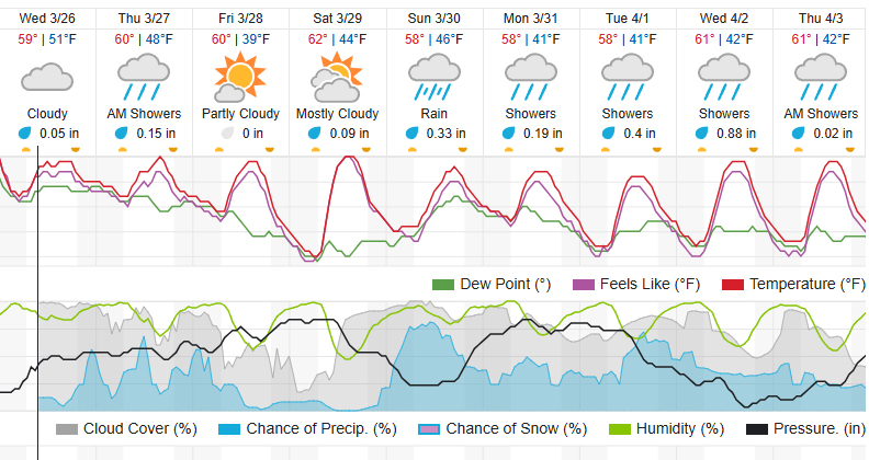 March is not going out like a lamb, this year. Our region is in for a week of rain as another, and unusual spring Atmospheric River comes ashore and washes our area for the next week to ten days.