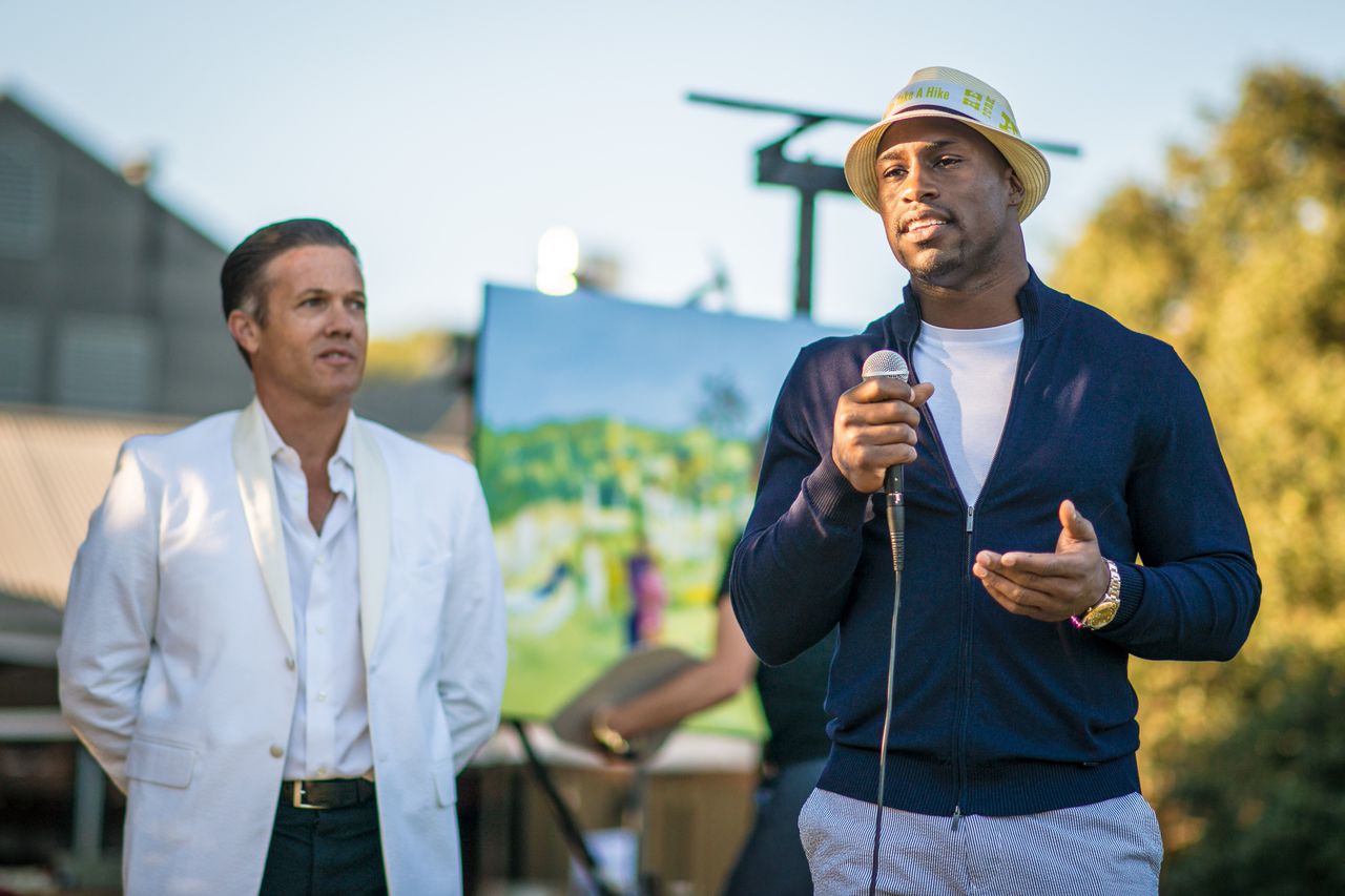 As Krave Jerky CEO and founder Jon Sebastiani looks on, San Francisco 49er Vernon Davis fires up the crowd at the “Krave the Unexpected” event at Imagery Estate Winery.