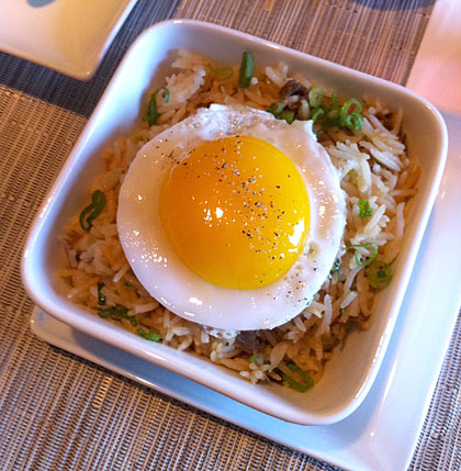 When dining that evening at Morimoto, I ordered a couple of side dishes that ended up being, quite possibly, one of my favorite meals in a long while. Duck fried rice was a hearty concoction of jasmine rice studded with tender shredded duck, petite peas and a tiny dice of carrot. The whole thing was crowned with the most magnificent, oozing, fried egg for a mere $6.