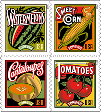 The newest foodie focused stamp released by USPS was unveiled at the California State Fair. It celebrates the summer harvest, with vintage produce style advertising – watermelons, cantaloupes, tomatoes and corn.