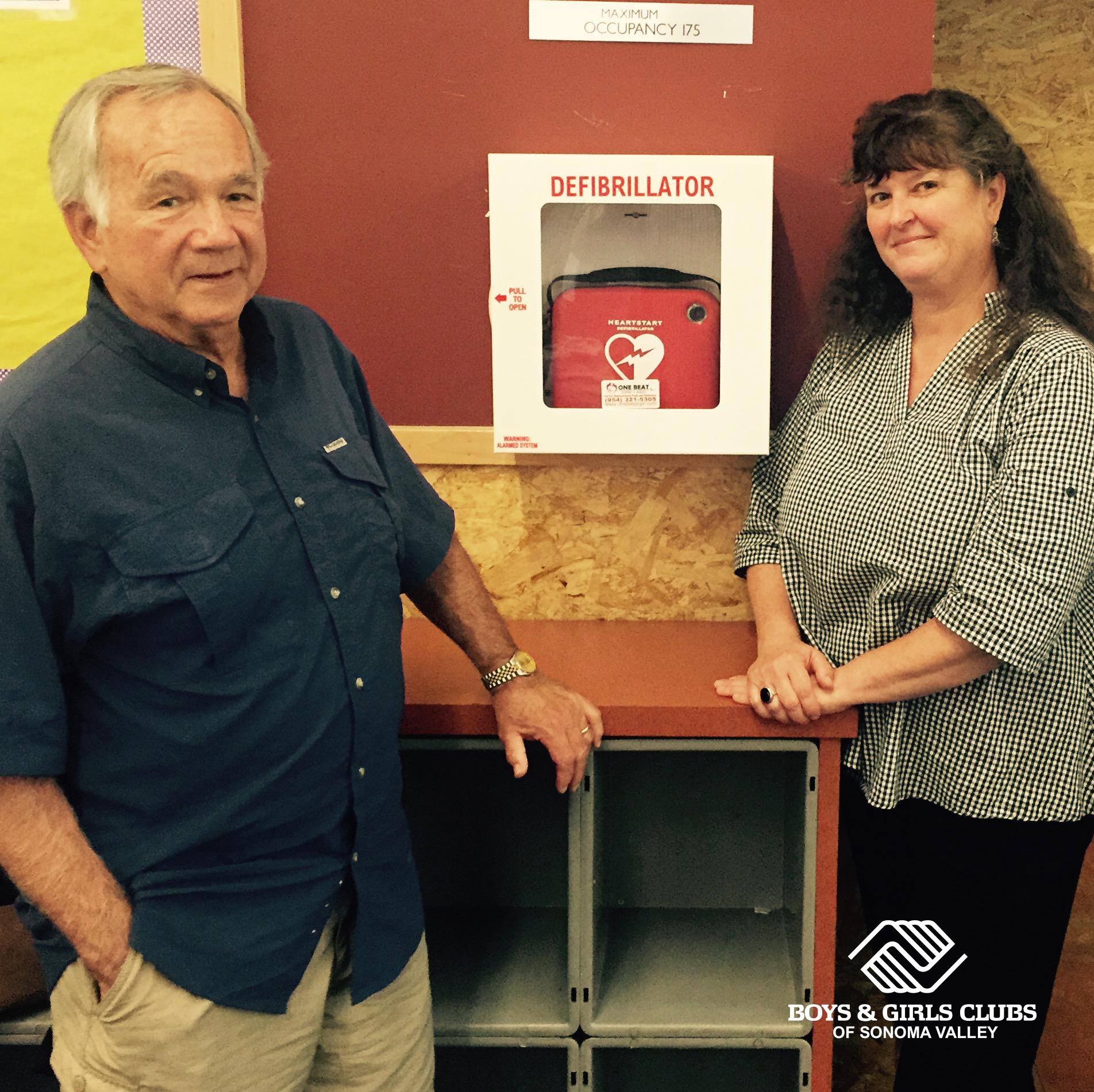 Barbara Cullen, Kiwanis President, at right, and Randy Derwingson, Kiwanis Committee Chair, show off the new Automated External Defibrillator (AED) the organization donated to the Boys & Girls Clubs of Sonoma Valley.