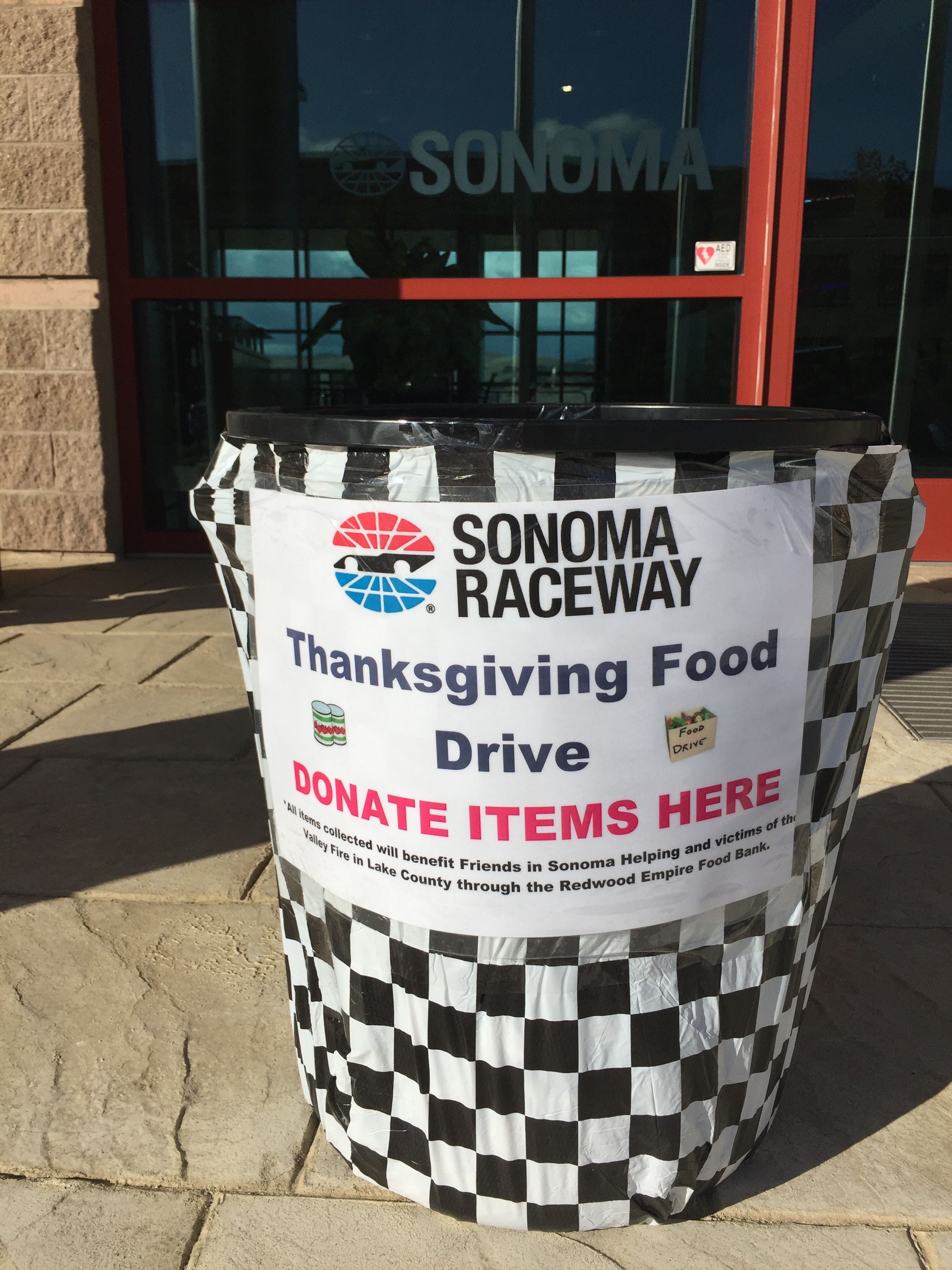 Sonoma Raceway has launched its 15th annual food drive, which benefits Friends in Sonoma Helping (FISH) and Redwood Empire Food Bank. It runs now through November 20.