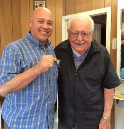 After 61 years cutting hair in the same Springs location, John Mazza, right, hands the keys to the Boyes Barber Shop to new owner Antonio Juan. After 25 years in the Coast Guard, Juan, a South San Francisco native, went to barber school with the idea of opening a shop in the Valley.