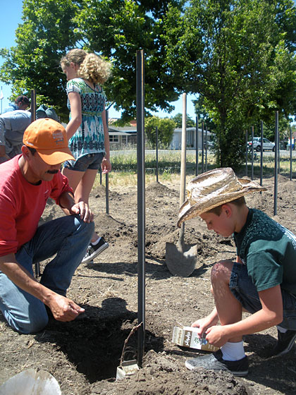 Isidro Corona, vineyard manager for Sonoma Creek Land and Farm Vineyard Management instructs 4-H member Ryan Sherwood in the proper way to plant a young grape vine. The pair took part in a planting day at Adele Harrison Middle School where a 120-vine educational Zinfandel... Continue