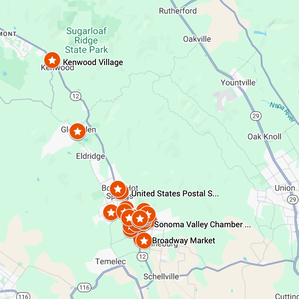 Printed copies of the Sun can be found in boxes around Sonoma Plaza and at the Post Office on Broadway, in addition to the locations below: (More coming!)