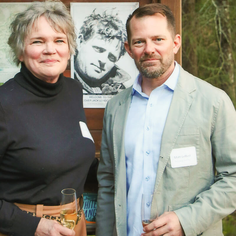 Tjiska Van Wyk, the outgoing director of Jack London Park Partners, shares smile with Matt Leffert, her successor, at reception at the House of Happy Walls Museum. The torch-passing occasion also welcomed new Board President Peter Ferris,who replaced Lynn Deegan McGraw in that role. State Senator Bill Dodd and First District Supervisor Susan Gorin were among the guests at the February 22 affair.