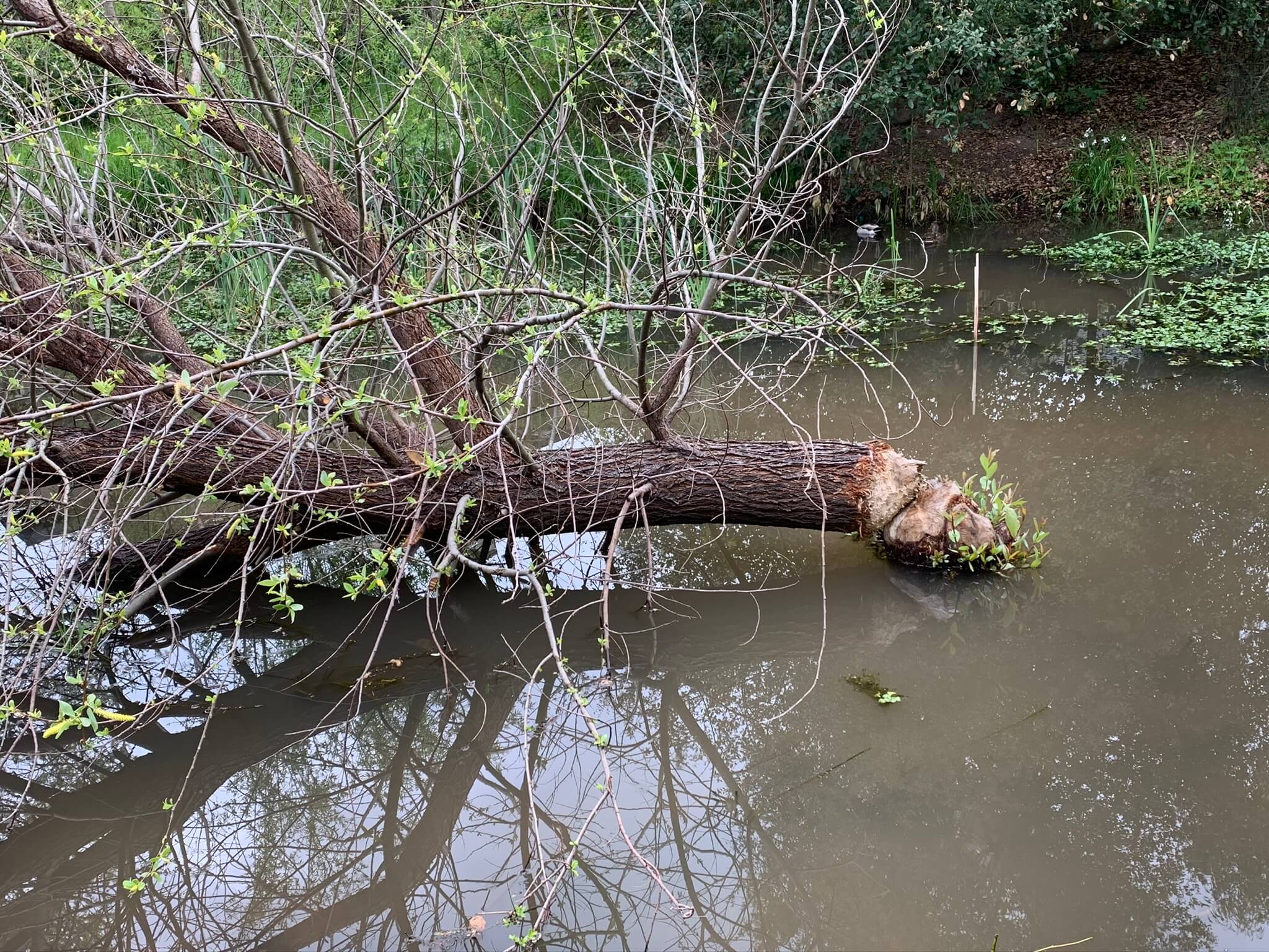 The beavers have been hard at work, and evidence of their engineering skills can be seen in the trees felled by their own sharp teeth. The pond created by their efforts now provides a swimming hole for ducks, and some of them can be seen nesting in the weeds and rushes bordering the creek.